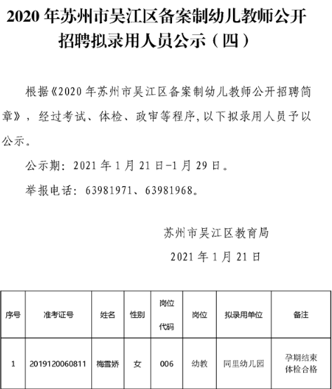 2020年江蘇省蘇州市吳江區(qū)備案制幼兒教師公開招聘擬錄用人員公示(四)