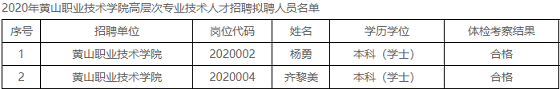 根據(jù)《2020年黃山職業(yè)技術(shù)學(xué)院高層次專業(yè)技術(shù)人才招聘公告》規(guī)定,經(jīng)報(bào)名、資格審查、專業(yè)測試、體檢、考察等程序,現(xiàn)將2020年黃山職業(yè)技術(shù)學(xué)院高層次專業(yè)技術(shù)人才招聘擬聘用2名工作人員予以公示。