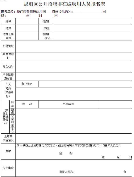 (1)完整填寫《思明區(qū)公開招聘非在編聘用人員報名表》一份(詳見附件1)