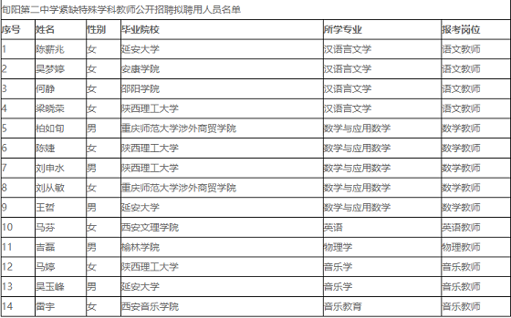 根據(jù)《2020年旬陽第二中學(xué)緊缺特殊學(xué)科教師公開招聘公告》規(guī)定,經(jīng)過現(xiàn)場報名與資格審查、面試、體檢、考察等程序,現(xiàn)將擬聘用人員予以公示,公示期為1月26日至2月1日。