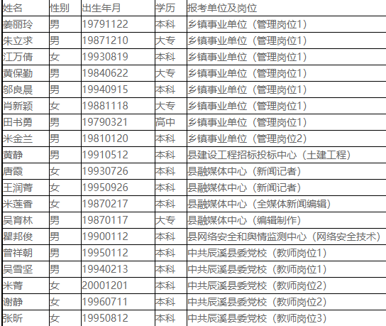 根據(jù)《辰溪縣2020年公開(kāi)招聘事業(yè)單位工作人員簡(jiǎn)章》要求,通過(guò)報(bào)名與資格審查、筆試、面試、體檢、考察等招聘程序,確定19名擬聘用人員,現(xiàn)予公示
