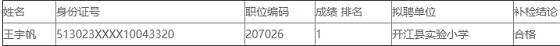 按照《達(dá)州市2020年上半年公開考試招聘事業(yè)單位工作人員公告》規(guī)定,經(jīng)過筆試、面試、體檢、考核,對體檢缺項(xiàng)暫不作結(jié)論(孕期)的考生王宇帆組織了補(bǔ)檢,現(xiàn)將補(bǔ)檢結(jié)論及擬聘用事項(xiàng)予以公示。