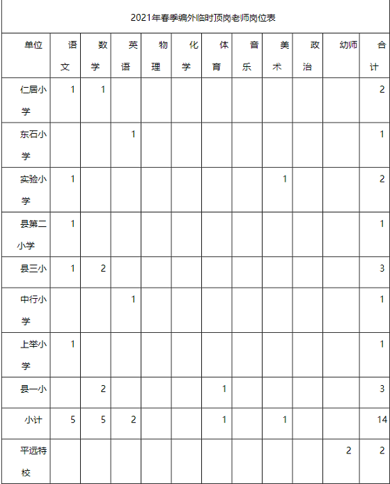 根據(jù)平遠(yuǎn)縣中小學(xué)2020至2021學(xué)年度第二學(xué)期實(shí)際崗位需求,決定面向社會公開招聘編外臨時(shí)頂崗教師21名,F(xiàn)將有關(guān)事項(xiàng)公告如下:
