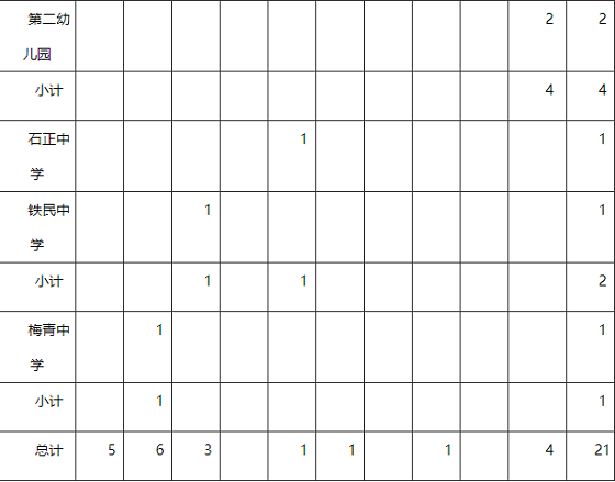 中學(xué)3人,小學(xué)14人,幼兒園4人。其中語文5人,數(shù)學(xué)6人,英語3人,化學(xué)1人,美術(shù)1人,體育1人,幼師4人,合計(jì)21人。