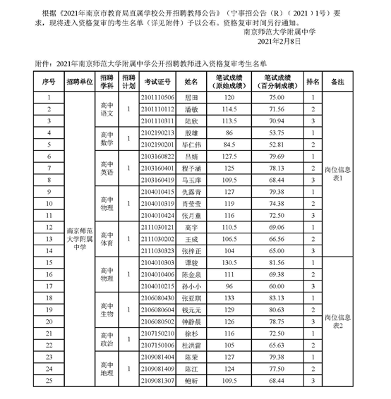 2021年南京師范大學(xué)附屬中學(xué)公開(kāi)招聘教師進(jìn)入資格復(fù)審考生名單公布