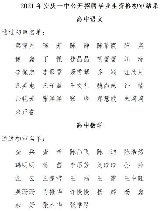 根據(jù)《安徽省安慶市第一中學(xué)面向高校公開(kāi)招聘2021屆優(yōu)秀畢業(yè)生公告》《安慶一中面向全國(guó)公開(kāi)選調(diào)優(yōu)秀高中教師公告》,市教體局、市委編辦、市人社局、市紀(jì)委監(jiān)委駐市教體局紀(jì)檢組、安慶一中聯(lián)合組成資格審查小組,對(duì)在規(guī)定時(shí)間內(nèi)提交報(bào)名材料人員進(jìn)行了資格初審。經(jīng)報(bào)安慶一中教師招聘、選調(diào)工作領(lǐng)導(dǎo)小組研究同意,現(xiàn)將資格初審?fù)ㄟ^(guò)名單予以公布: