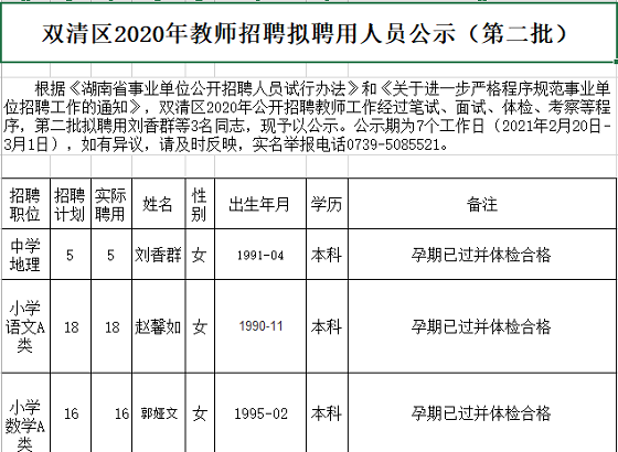 2020年湖南邵陽(yáng)雙清區(qū)教師招聘擬聘用人員公示(第二批)