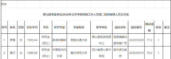 附件:屏山縣事業(yè)單位2020年公開(kāi)考核招聘工作人員第二批擬聘用人員公示表