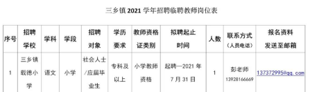 根據(jù)教育事業(yè)發(fā)展需要,現(xiàn)三鄉(xiāng)鎮(zhèn)教體文旅局,面向全國招聘臨聘教師1名,具體情況如下: