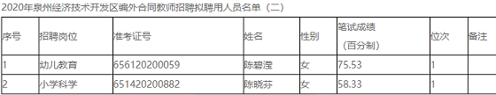 附:2020年泉州經(jīng)濟技術開發(fā)區(qū)編外合同教師招聘擬聘用人員名單(二)