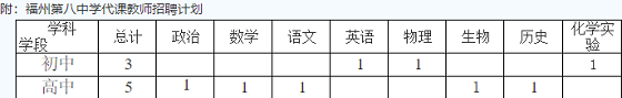 因工作需要,福州第八中學代課教師8名,具體招聘數(shù)附后,具體要求如下: