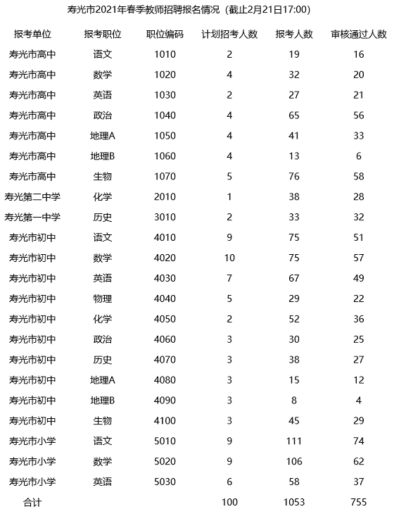 2021年山東省濰坊壽光市春季教師招聘報(bào)名情況(截止2月21日17:00)