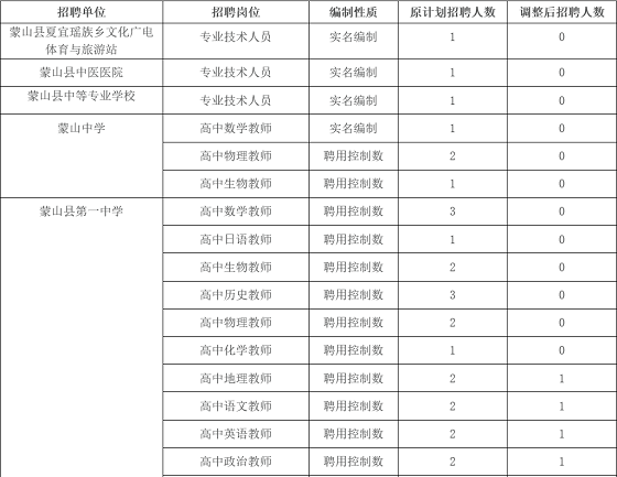 因部分崗位無人報名或報名人數(shù)不達1:3的比例,現(xiàn)將《2021年蒙山縣第一次直接面試招聘事業(yè)單位工作人員簡章》的招聘計劃調(diào)整如下: