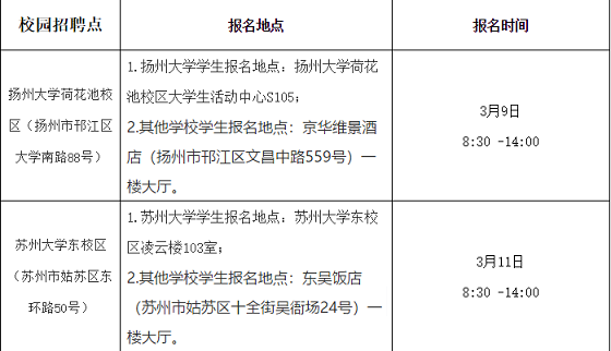 本次招聘先后在揚州大學荷花池校區(qū)(揚州市邗江區(qū)大學南路88號)和蘇州大學東校區(qū)(蘇州市姑蘇區(qū)東環(huán)路50號)設招聘點,采取現(xiàn)場報名的方式進行。
