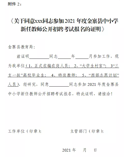 4.機(jī)關(guān)、事業(yè)單位在編正式工作人員(含服務(wù)期特崗教師)須按干部人事管理權(quán)限提供單位和主管部門(mén)同意報(bào)考的證明。同意報(bào)考證明式樣詳見(jiàn)附件2:《關(guān)于同意ⅹⅹⅹ同志參加2021年度金寨縣中小學(xué)新任教師公開(kāi)招聘考試報(bào)名的證明》。