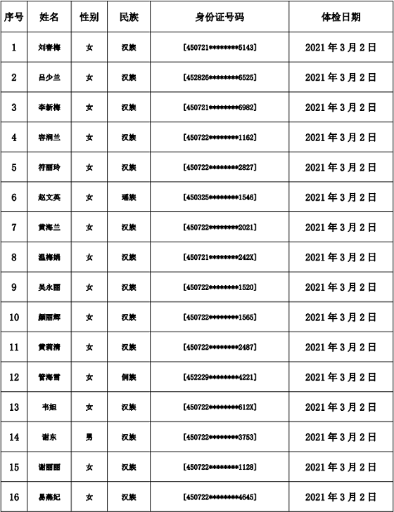 根據(jù)《2020年浦北縣公開考試招聘中小學(xué)及幼兒園教師公告》的文件精神,2020年浦北縣公開考試招聘中小學(xué)及幼兒園教師工作經(jīng)過筆試、面試、政審等程序,劉春梅等33名同志(附件)進(jìn)入體檢環(huán)節(jié),為了完成體檢工作,現(xiàn)作以下公告: