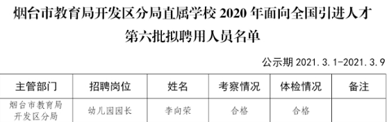 按照規(guī)定,經(jīng)考試、考察、體檢等環(huán)節(jié),李向榮被確定為煙臺(tái)市教育局開發(fā)區(qū)分局直屬學(xué)校2020年面向全國(guó)引進(jìn)人才第六批擬聘用人員,現(xiàn)公示如下,公示期為7個(gè)工作日(名單附后)。公示期間如有異議,請(qǐng)與煙臺(tái)市教育局開發(fā)區(qū)分局政工處聯(lián)系,監(jiān)督電話:0535-6396721.