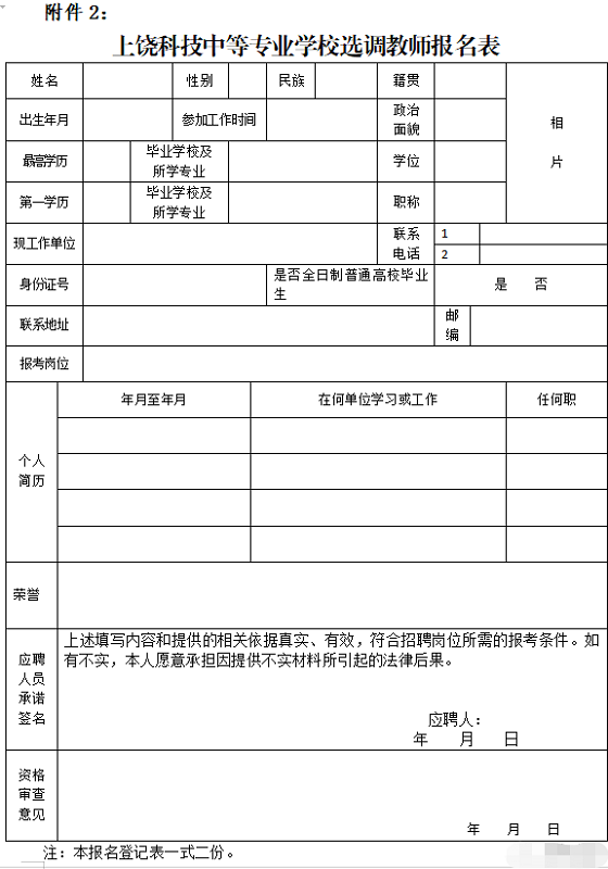 (3)報名材料:《上饒科技中等專業(yè)學校選調教師報名表》一式兩份;身份證、學歷證書、《教育部學歷證書電子注冊備案表》、教師資格證書、榮譽證書原件及復印件各一份、師德考核結果和年度考核結果證明;近期同底正面免冠小2寸彩色照片3張。