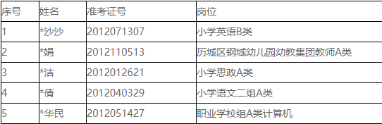 現(xiàn)將2020年濟(jì)南市歷城區(qū)教育體育系統(tǒng)公開招聘教師考察體檢遞補(bǔ)人員名單進(jìn)行公示,名單如下: