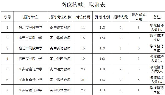 宿遷市2021年市直教育系統(tǒng)第一批公開(kāi)招聘工作人員報(bào)名工作已于2021年3月5日下午4:00結(jié)束,根據(jù)《宿遷市2021年市直教育系統(tǒng)第一批公開(kāi)招聘公告》要求,現(xiàn)將未達(dá)到開(kāi)考比例的崗位予以取消或核減。請(qǐng)報(bào)考被取消崗位并已完成繳費(fèi)的考生,可在原網(wǎng)站重新補(bǔ)報(bào)其他符合條件的崗位,補(bǔ)報(bào)名時(shí)間:2021年3月9日12∶00—16∶00。