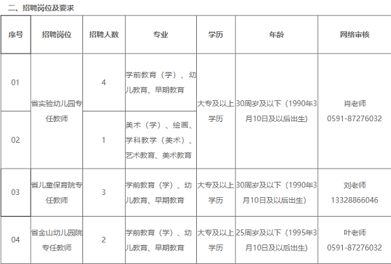 根據(jù)福建省教育廳、省人社廳、省委編辦《關(guān)于做好2021年全省中小學(xué)幼兒園新任教師公開招聘工作的通知》(閩教師〔2021〕1號(hào))和《福建省省屬事業(yè)單位公開招聘工作人員考試暫行辦法》,因工作需要,省婦聯(lián)直屬幼兒園擬向社會(huì)公開招聘新任教師10名。現(xiàn)制定工作方案如下: