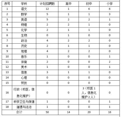 學(xué)校本次招聘高中、初中分開考核,材料準(zhǔn)備中應(yīng)注明應(yīng)聘崗位為:①高中崗位、②初中崗位、③小學(xué)崗位、④高初中崗位均可、⑤初中、小學(xué)崗位均可。學(xué)校根據(jù)本人選擇組織相應(yīng)考核。
