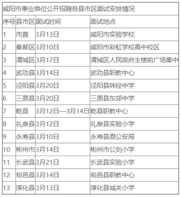 為確保2020年咸陽(yáng)市事業(yè)單位公開(kāi)招聘各崗位面試工作有序順利進(jìn)行,現(xiàn)將各縣市區(qū)面試時(shí)間及地點(diǎn)安排通知如下: