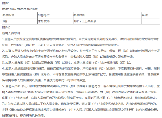 3.參加技能測(cè)試的應(yīng)聘人員應(yīng)提前做好與技能測(cè)試相關(guān)的準(zhǔn)備工作。體育教師崗位應(yīng)聘人員應(yīng)自備運(yùn)動(dòng)服裝、運(yùn)動(dòng)鞋。