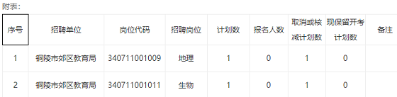 根據(jù)《2021年度銅陵市郊區(qū)面向社會(huì)公開招聘中小學(xué)教師公告》規(guī)定和報(bào)名情況,經(jīng)審定,現(xiàn)將報(bào)名后達(dá)不到規(guī)定開考比例的部分崗位計(jì)劃取消或相應(yīng)核減該崗位計(jì)劃數(shù)情況予以公布(具體見附表)。其中,被取消崗位報(bào)名成功的人員,可在3月11日8:00至12:00進(jìn)行一次改報(bào),逾期不再受理。對(duì)于改報(bào)的報(bào)考人員,郊區(qū)教育局于3月12日12:00前完成資格審核。逾期不改報(bào)的視為放棄。