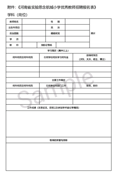 附件:《河南省實(shí)驗(yàn)思念航城小學(xué)優(yōu)秀教師招聘報(bào)名表》