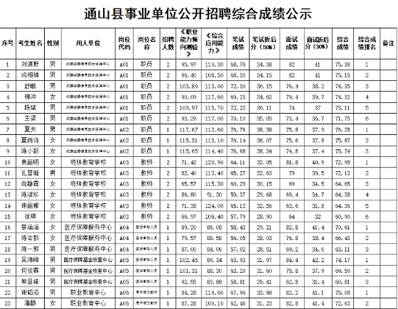 根據(jù)《通山縣2020年事業(yè)單位公開招聘公告》(2020年度第二批)要求,將筆試、面試按公告要求折算后總成績,現(xiàn)予以公示。如有疑議,請?jiān)?021年3月29日前到通山縣人社局事業(yè)單位人員管理股反映,聯(lián)系電話:0715-2880078。同時(shí),請考生密切關(guān)注通山政務(wù)網(wǎng)、云上通山客戶端公告,公示期滿后將擇時(shí)組織體檢考察。