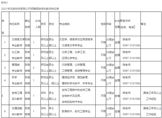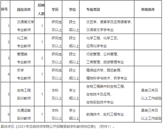 附件:1.2021年龍巖技師學院公開招聘緊缺學科教師崗位表