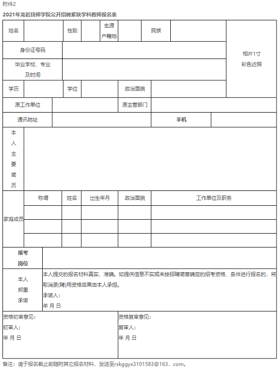 1.《2021年龍巖技師學院公開招聘緊缺學科教師報名表》(附件2);