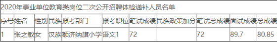 阿拉善盟2020年事業(yè)單位教育類崗位二次公開招聘筆試、面試工作已經(jīng)結(jié)束,因個別考生自愿放棄,依據(jù)《阿拉善盟2020年事業(yè)單位教育類崗位二次公開招聘簡章》,對自愿放棄后出現(xiàn)缺額的崗位,在筆試成績達(dá)到最低合格分?jǐn)?shù)線以上報考人員中,按照筆試總成績從高分到低分的順序依次遞補,現(xiàn)將遞補人員名單公告如下: