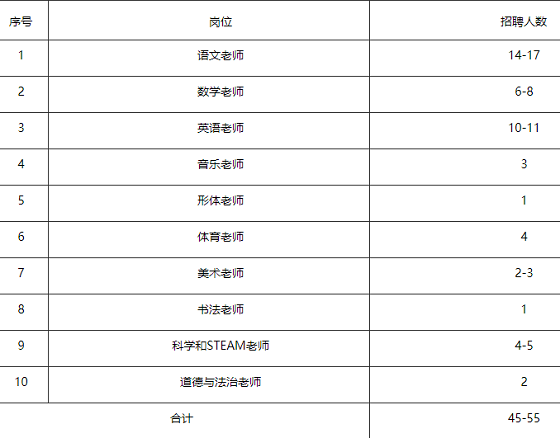 崗位:小學(xué)語文、數(shù)學(xué)、英語、STEAM課程、藝術(shù)、體育等各學(xué)科教師
