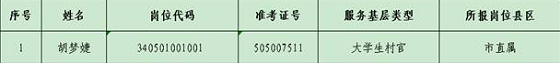 根據(jù)安徽省教育廳、中共安徽省委機(jī)構(gòu)編制委員會(huì)辦公室、安徽省財(cái)政廳、安徽省人力資源和社會(huì)保障廳《關(guān)于進(jìn)一步完善中小學(xué)新任教師招聘制度落實(shí)市縣中小學(xué)教師招聘主體責(zé)任的通知》(皖教秘師[2020]90號(hào))精神及《2021年馬鞍山市教育局直屬學(xué)校新任教師公開招聘公告》規(guī)定,經(jīng)審核,胡夢(mèng)婕考生符合2021年馬鞍山市教育局直屬學(xué)校新任教師公開招聘筆試的“服務(wù)基層項(xiàng)目”加分條件,現(xiàn)予公示,如有異議,請(qǐng)向市教育局人事科反映。