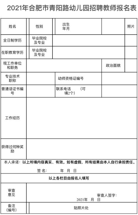 應(yīng)聘教師可下載《2021年合肥市青陽(yáng)路幼兒園招聘教師報(bào)名表》,填寫(xiě)后將電子表格和以下材料原件掃描件或照片發(fā)到郵箱:包括學(xué)歷證書(shū)(最高學(xué)歷、學(xué)前教育專(zhuān)業(yè))、幼兒教師資格證、普通話(huà)等級(jí)證書(shū)及其它相關(guān)證書(shū)。
