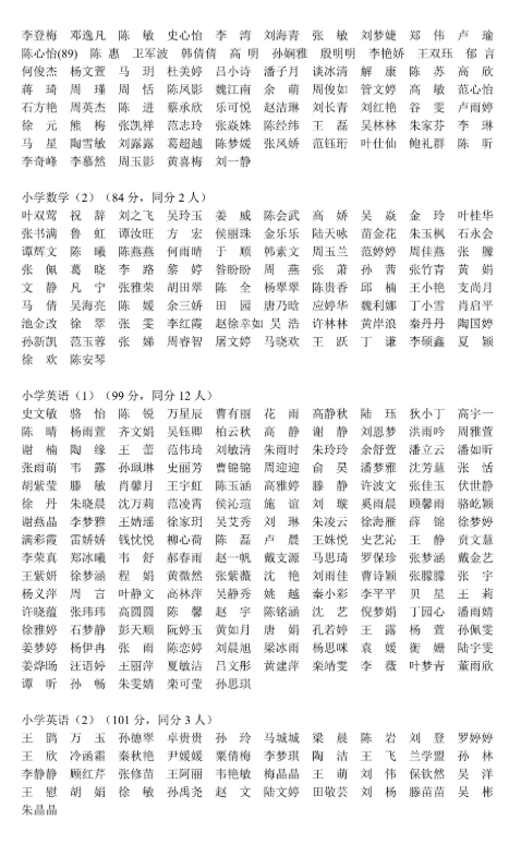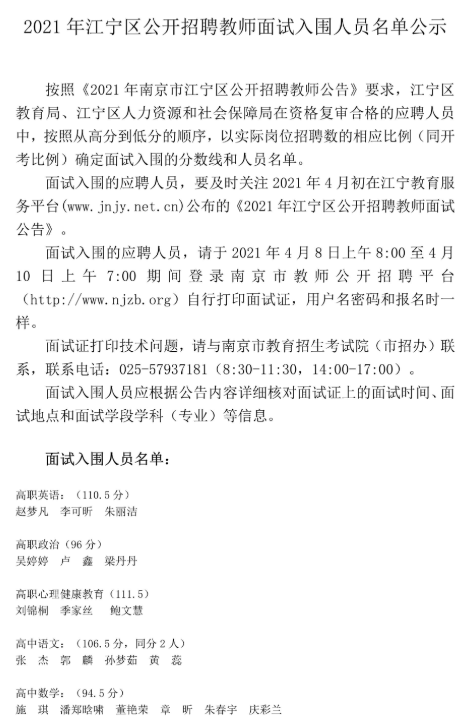 2021年江蘇省南京江寧區(qū)公開招聘教師面試入圍人員名單公示(上報確認(rèn))