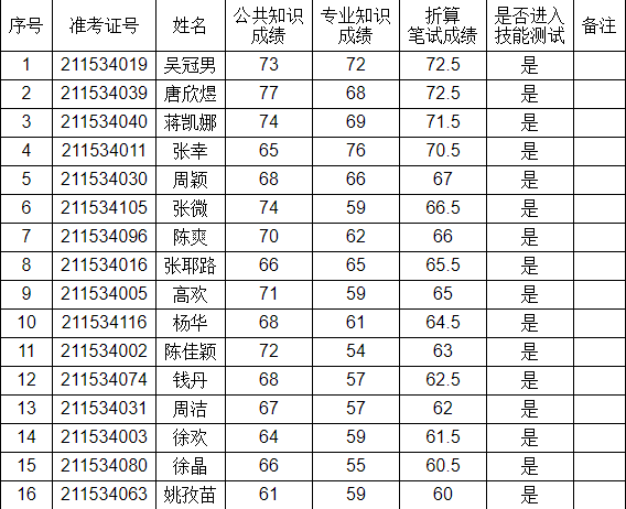 二、報(bào)考幼兒教師Y02崗位進(jìn)入技能測(cè)試名單及筆試成績(jī)(總計(jì)16人)