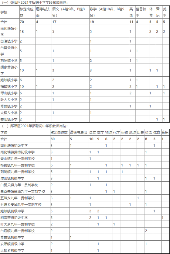 鄖陽(yáng)區(qū)2021年面向社會(huì)公開招聘義務(wù)教育學(xué)校教師120名,其中小學(xué)學(xué)段70名、初中學(xué)段50名。具體崗位為: