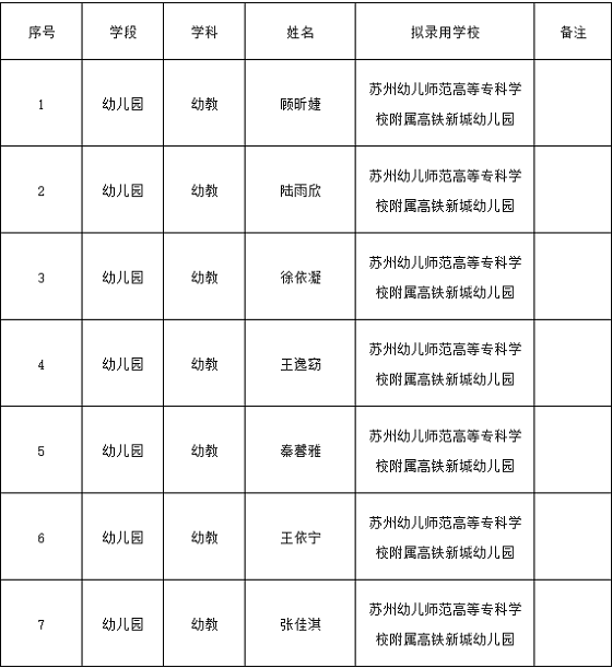 根據(jù)《2021年蘇州幼兒師范高等?茖W(xué)校附屬高鐵新城幼兒園公開招聘教師簡章》規(guī)定,經(jīng)公開報名、筆試、面試、考察(政審)、體檢等程序,初步確定擬錄取以下7名同志為相城區(qū)年金制教師,現(xiàn)予以公示,公示時間為7個工作日(4月9日—4月19日)。