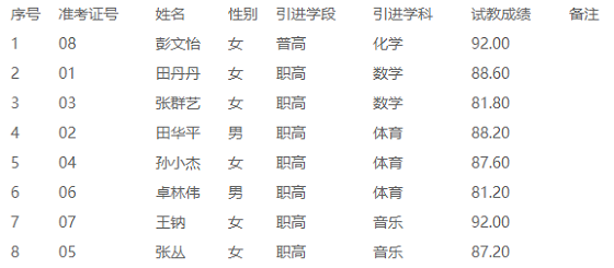 根據(jù)《慈利縣2021年公開(kāi)引進(jìn)急需緊缺人才公告》要求,現(xiàn)將慈利縣2021年公開(kāi)引進(jìn)急需緊缺人才教育崗位考核(試教)成績(jī)予以公示: