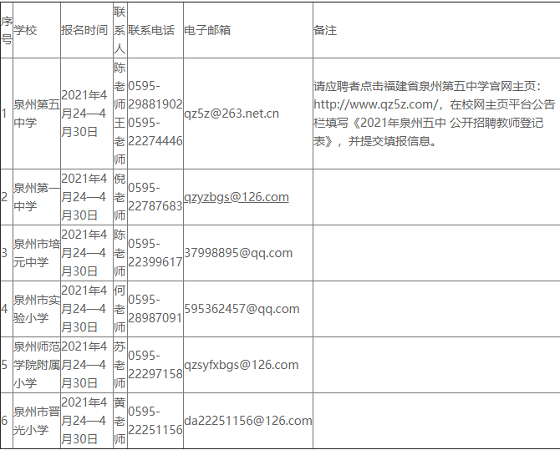 根據(jù)事業(yè)單位公開招聘工作人員等有關(guān)規(guī)定及《福建省教育廳福建省人力資源和社會保障廳中共福建省委機構(gòu)編制委員會辦公室關(guān)于做好2021年全省中小學(xué)幼兒園新任教師公開招聘工作的通知》(閩教師〔2021〕1號)精神,結(jié)合教學(xué)工作需要,泉州市教育局決定組織市直部分公立學(xué)校專項公開招聘新任教師工作,制定具體方案如下: