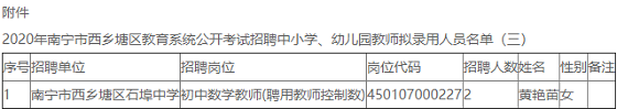 根據(jù)《2020年南寧市西鄉(xiāng)塘區(qū)教育系統(tǒng)公開(kāi)考試招聘中小學(xué)、幼兒園教師簡(jiǎn)章》等有關(guān)規(guī)定,經(jīng)過(guò)網(wǎng)上報(bào)名、資格審查、面談、面試、考察、體檢等程序,確定黃艷苗同志為2020年南寧市西鄉(xiāng)塘區(qū)教育系統(tǒng)公開(kāi)考試招聘擬錄用教師(詳見(jiàn)附件)。現(xiàn)將名單予以公示,公示期7個(gè)工作日。對(duì)公示的擬錄用人員如有異議,請(qǐng)以書面形式,并署真實(shí)姓名和聯(lián)系方式,于2021年4月26日前郵寄或直接送達(dá)西鄉(xiāng)塘區(qū)教育局紀(jì)檢室(直接送的以送達(dá)日期為準(zhǔn),郵寄的以郵戳為準(zhǔn))。群眾如實(shí)反映擬聘人員的有關(guān)問(wèn)題受法律保護(hù)。