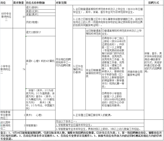 根據(jù)《2021年江門市蓬江區(qū)招聘教師暨面向全國選調(diào)引進優(yōu)秀教育人才公告》,現(xiàn)就蓬江區(qū)本地專場招聘的有關(guān)事項公告如下: