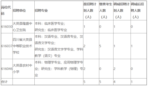 2021年上半年大英縣部分事業(yè)單位公開考試招聘工作人員報名工作已結(jié)束。由于個別招聘崗位報名人數(shù)未達到規(guī)定開考比例,根據(jù)《關(guān)于2021年上半年大英縣部分事業(yè)單位公開考試招聘工作人員的公告》規(guī)定,現(xiàn)將大英縣部分事業(yè)單位公開考試招聘工作人員個別崗位招聘計劃作如下調(diào)減: