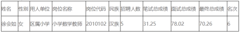 小學(xué)數(shù)學(xué)教師崗位因有考生體檢不合格,根據(jù)《攀枝花市東區(qū)人力資源和社會保障局攀枝花市東區(qū)教育和體育局關(guān)于攀枝花市東區(qū)2020年下半年公開考試招聘中小學(xué)教師公告》規(guī)定,按照該招聘崗位已參加面試人員總成績從高分到低分依次遞補(bǔ)一次。遞補(bǔ)小學(xué)數(shù)學(xué)教師崗位考生徐會如進(jìn)入體檢。