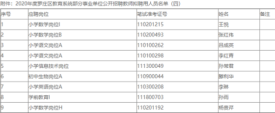 2020年度羅莊區(qū)教育系統(tǒng)部分事業(yè)單位公開招聘教師,經(jīng)過筆試、面試、考察和體檢,現(xiàn)將擬聘用人員予以公示(名單附后)。公示期7個(gè)工作日(2020年5月6日—5月13日)。