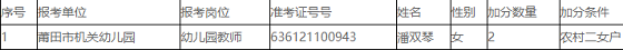 根據(jù)《2021年莆田市機(jī)關(guān)幼兒園公開招聘新任教師方案》規(guī)定,我處于2021年4月29日受理參加2021年莆田市機(jī)關(guān)幼兒園公開招聘新任教師考生的筆試加分申請(qǐng)。經(jīng)審核,現(xiàn)將1名符合有關(guān)文件規(guī)定,擬進(jìn)行筆試加分的考生名單(見下表)予以公示,公示時(shí)間:2021年5月6日—5月12日。在此期間,如有異議,可通過來電、來信、來訪的方式向莆田市機(jī)關(guān)事務(wù)管理處反映,逾期不予受理。聯(lián)系電話(上班時(shí)間):0594-2223233。