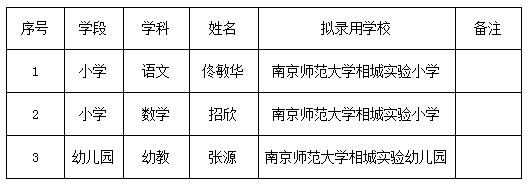 根據(jù)《2021年南京師范大學(xué)相城實驗小學(xué)(幼兒園)公開招聘教師簡章》規(guī)定,經(jīng)公開報名、筆試、面試、考察(政審)、體檢等程序,初步確定擬錄取以下3名同志為相城區(qū)年金制教師,現(xiàn)予以公示,公示時間為7個工作日(5月8日—5月17日)。